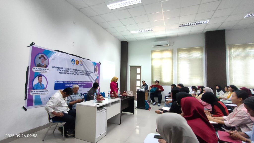 Jum’at, 26 September 2025 Program Studi Kesehatan Masyarakat Program Magister FKM Untad melaksanakan “WORKSHOP TEKNOLOGI INFORMASI DALAM PEMBELAJARAN (PENGGUNAAN PERANGKAT LUNAK ANALISIS DATA KESEHATAN DAN ALAT KOLABORASI DIGITAL) bagi Dosen dan Mahasiswa di Aula Program Studi Gizi FKM Untad