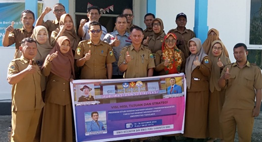 Di hari kedua pelaksanaan publikasi dan sosialisasi dilakukan dikantor dinas kesehatan yang dipandu langsung oleh sekertaris dinas kesehatan kabupaten Buol (Bapak dr. Arianto.,M.A.P) bersama beberapa staf yang ada dilingkungan dinas kesehatan dan puskesmas, pada kegiatan ini dilanjutkan dengan dialog bersama peserta.